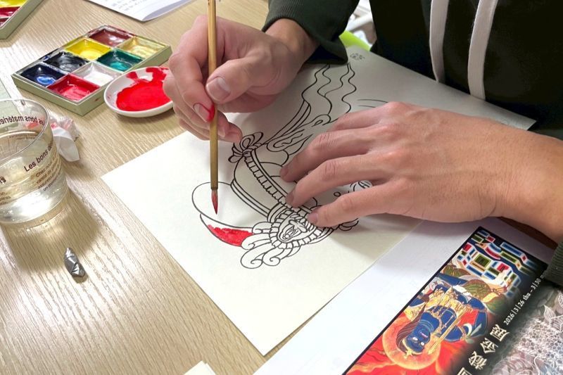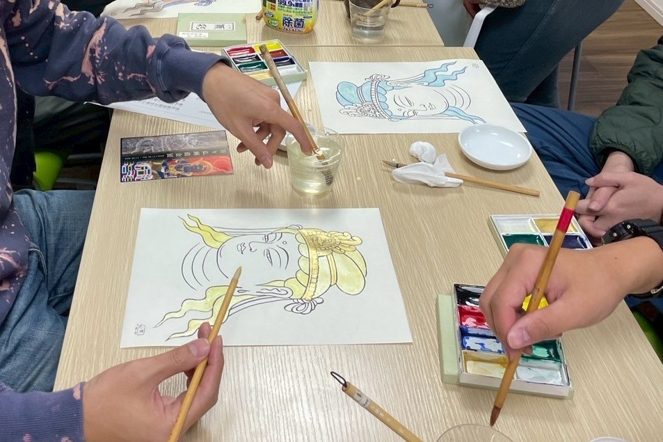 山梨県北杜市にある、安達原玄仏画美術館の安達原千雪館長を講師に、仏画に取り組んでいます。心理的な安定をもたらし、集中力や想像力が育まれる効果があります。それぞれが好きな色を、細やかに時に大胆に塗っていくことで、自分だけの作品が完成します。